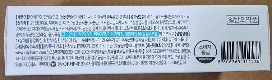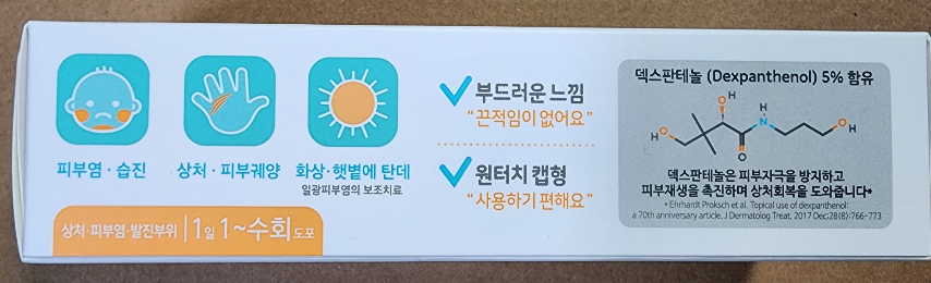이전에는 비판* 크림(아기 그려진 연고)을 썼었는데, 얼굴에 바르면 머리카락이 잘 붙고 좁쌀이 생겨서 잘 안 바르게 되었어요. 약국에서 알게 되어 D 판테놀 연고로 정착. 앞으로도 계속 사용해 볼 것입니다.
